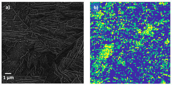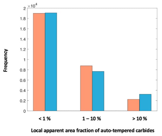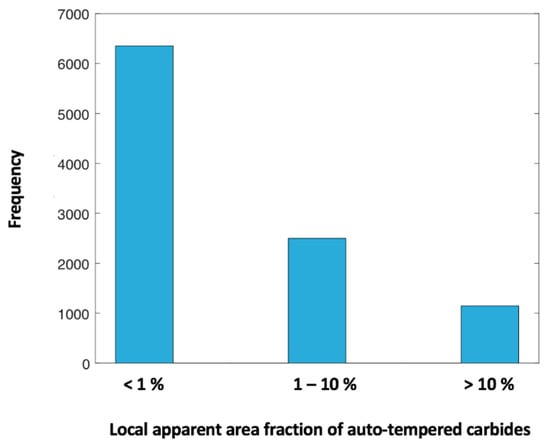 The local area fractions of auto-tempered carbides were best visualized using a color map, as shown in Figure 6. Figure 7 shows a histogram of the frequencies of the different local area fractions of auto-tempered carbides.