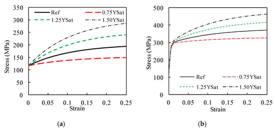 The set of material properties that best describe the cyclic behaviour of the SS304L is presented in Table 2, labeled as “Reference”. The optimization procedure that was performed to identify these material properties can be found in a previous work [27,28]. Table 2 also presents the numerical changes (−25%, +25%, and +50% of the “Reference” case) in the isotropic parameters YSat and CY. The case “0.50YSat” was not considered because it leads to softening (i.e., YSat < Y0). Figure 1 presents the isotropic and mixed hardening stress–strain curves for the materials presented in Table 2, for monotonic uniaxial tension; accordingly, the isotropic hardening curves (see Figure 1a) were obtained from Equation (4) and the mixed hardening curves (see Figure 1b) were obtained from Equation (1). As expected, the level of the mixed-hardening stress–strain curves (see Figure 1b) was higher than that of the isotropic hardening curves (see Figure 1a). Accordingly, the mixed-hardening cases from Table 1 offer greater resistance to plastic deformation than the isotropic hardening cases. Moreover, the sensitivity to numerical changes in YSat is higher for isotropic hardening than for mixed-hardening (see Figure 1). Similar trends were obtained for CY.