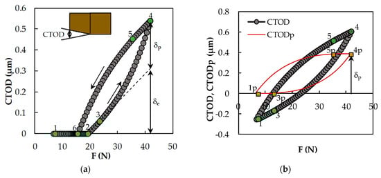 Figure 2a shows a common variation of crack tip opening displacement, CTOD, with the applied load, F, in simulations with the crack closure phenomenon. These curves are constituted by several regimes. In regime 1,2, the crack is closed despite the increase of F. At point 2, the opening of the crack occurs. When the crack first opens, it experiences purely elastic deformation, as shown in regime 2,3. Point 3 corresponds to the transition between purely elastic and elastic–plastic behaviour at the crack tip, and is characterized by a plastic crack tip opening displacement, CTODp, equal to 0.001 μm. This value is purely empirical. At this stage, the plastic deformation increases rapidly until it reaches the maximum value of F at point 4. The unloading of the specimens is similar to the loading process: first, the crack experiences purely elastic deformation in regime 4,5, followed by the elastic-plastic in regime 5,6. At point 6, the crack closes.