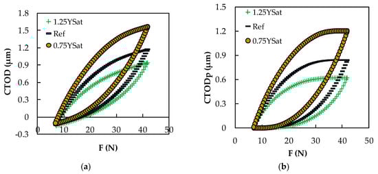 Figure 5a shows three CTOD versus F curves for the purely isotropic SS304L, in simulations with crack closure, in which the values of YSat were changed, corresponding to the cases “0.75YSat”, “Ref”, and “1.25YSat” in Table 2. The numerical changes made to YSat had a great influence on the range of CTOD values; in other words, the deformation obtained at the crack tip was deeply affected. As was expected, increasing the value of YSat reduced the CTOD range and the total deformation due to the reduction of the plastic deformation, as shown in Figure 5b. Also, it can be seen here that the crack opening load, Fopen, and the crack closure load, Fclose, were affected by the numerical changes. Fopen tended to increase and Fclose to decrease when the value of YSat was higher.