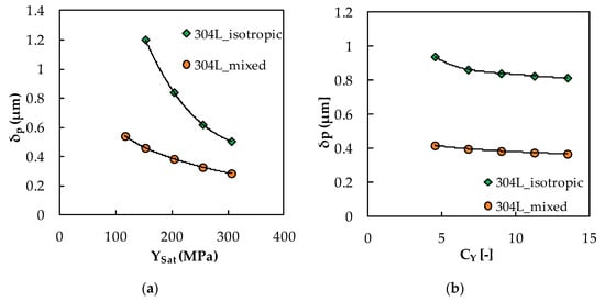 Figure 4a,b show the variation in the plastic CTOD range, δp, with YSat and CY, respectively, for the purely isotropic and mixed hardening models of the SS304L. Both figures show a non-linear variation of δp with the isotropic hardening parameters, making it difficult to establish analytical models containing these hardening parameters. The increase of the hardening parameters causes δp to decrease with a rate that also decreases with the hardening parameters. The reduction of δp is much more pronounced for YSat than for CY, which can be expected when considering the physical meaning of both parameters. Also, for both figures, the mixed hardening model achieves less δp than the isotropic hardening model. This supports the results shown in Figure 1, where mixed-hardening cases (see Figure 1b) offer greater resistance to plastic deformation than isotropic hardening cases (see Figure 1a).