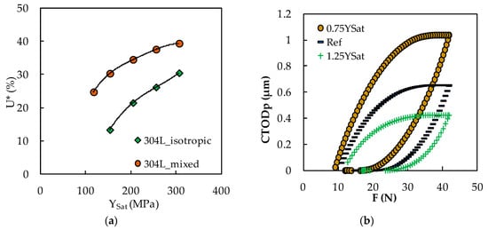 The plot of δp shown in Figure 8a,b serves as a function of YSat and CY, respectively. As noted in Figure 7a,b, the purely isotropic hardening model provided less U* than the mixed hardening model. Therefore, a more effective load range was available in the purely isotropic model, contributing to more plastic deformation, as shown in the results in Figure 8a,b. As in Figure 4a,b, the mixed hardening model achieved less δp than the pure isotropic model. The dashed lines indicate the values obtained without contact of crack flanks. The difference in the solid lines is the effect of crack closure, which is relevant in all cases.