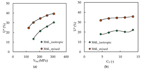 The crack closure levels are represented in Figure 7a,b: U* is a function of YSat and CY, respectively, for both the purely isotropic hardening and mixed hardening models. As previously stated, the increase of YSat caused Fopen to increase, and, therefore, it was expected that U* would increase, as shown in Figure 7a. Also, the purely isotropic hardening reduced U* in comparison with the mixed hardening. Despite the high numerical range of variation of the isotropic parameters, the variation of U* was relatively small for both hardening conditions (approximately 17% in Figure 7a and 4% in Figure 7b).