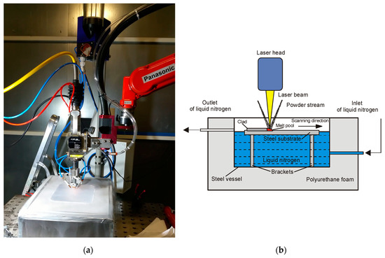 In order to conduct the technological tests of cladding at cryogenic conditions, a prototype stand was designed and custom made, as shown in Figure 2a. The powder was dosed by a disc rotary feeder PFU4 (Durum, Willich, Germany) in argon carrying gas at the pressure of 1.5 bar and the rate flow of 8.0 L/min. Powder was gravity transported from a disc feeder to the nozzles head through flexible PTFE tubes (Polytetrafluoroethylene—“Teflon”) with an inner diameter of 2.0 mm each. Three individual and cylindrical nozzles of 0.8 mm diameter for powder injection were mounted on the head, as shown in Figure 2a. The powder injection nozzles were adjustable and set in such a way to focus the three individual powder streams on the top surface of the melt pool in the region of laser beam interaction, as shown in Figure 2b. The nozzles had was integrated with the laser focusing head coupled by a fiberglass with the IPG YLS laser generator (IPG Photonics, Oxford, MA, USA), emitting at the wavelength of 1.07 µm. The positioning of the laser focusing head with coaxial powder injection nozzles was provided by a robot Panasonic GII TL-190 (Industrial Solutions Company, Panasonic Corporation, Osaka, Japan). The beam parameter product (BPP) of the laser beam is <4.0 mm·mrad, and it is characterized by a Gaussian energy distribution across the beam spot (Transverse Electromagnetic Mode; TEM00). With the applied configuration of the optics, the nominal beam spot diameter was 300 μm, which is typical for laser welding. In the case of laser cladding, a wider beam is advantageous; therefore, the laser beam was defocused by lifting the laser head. Thus, the focal plane was 30.0 mm over the top surface of the substrate (focal spot position +30 mm), which resulted in increasing the diameter of the region of laser beam irradiation on the substrate up to 1.3 mm. Prior to cladding tests, the steel substrate was sandblasted, providing repeatable surface conditions with the roughness of Ra 25–60 μm, after which it was cleaned by ethanol C2H5OH.
