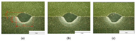An example of the measuring procedure for determining the characteristic geometry features and dimensions of the stringer beads (Table 4): (a) measuring of the bead dimensions; (b) determination of the heat-affected zone (HAZ) area; (c) determination of the total area of the clad layer (fusion zone + clad layer).