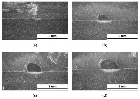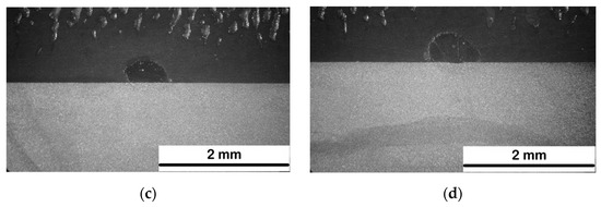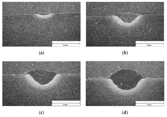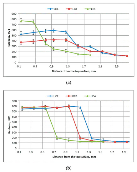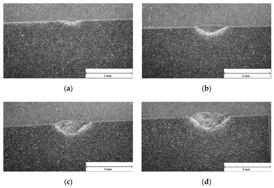 Hardness measurements were carried out on the cross-sections along the axis of symmetry of the individual bead, starting from under the top surface region (presented also in Figure 10). The measurements were carried out by means of the hardness tester WILSON WOLPERT 401 MVD (Wolpert Wilson Instruments, Aachen, Germany) at the load of 10 N and the dwell time of 10 s. The distance between the subsequent points was 0.3 mm.