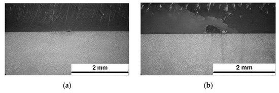 At a certain depth related to the clad thickness (both the clad height and penetration depth), the hardness decreases gradually until reaching the value of the base metal (S235JR) of the substrate at approximately 120–130 HV1. The gradual decrease in hardness occurs in the heat-affected zone (HAZ). Based on the hardness distribution in the HAZ, the width of this region can be specified at 0.8 to 1.3 mm for the tested clads. It can be also verified on the cross-sections in Figure 5 and Figure 6. Since the fusion line is considered as an interface line for a coating, and the HAZ is considered as the interface region, it can be concluded that in the case of clad layers produced by conventional laser cladding at free cooling, the interface region is “wide and smooth”.