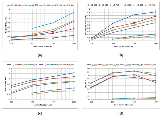 Influence of the process parameters and cooling conditions on the geometry and dimensions of the stringer beads produced by laser deposition of Fe-based powder (Table 3 and Table 4): (a) height of the clad (reinforcement); (b) penetration depth into the substrate; (c) width of the single clad layer; and (d) calculated rate of dilution.