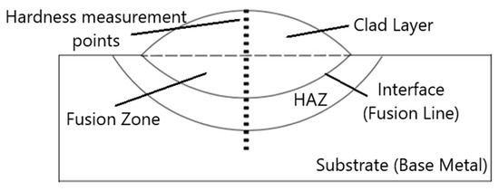 Scheme of hardness measurements and characteristic features of single bead geometry, as shown in Figure 11.