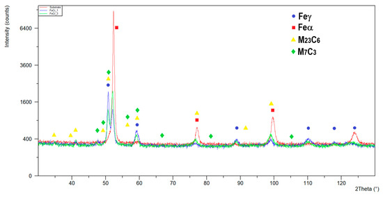 The X-ray diffraction pattern of the substrate (“substrate” red line in Figure 12) indicated dominant peaks from Fe-α, which is typical for non-alloy steel. In the case of the X-ray diffraction patterns of the tested coatings, the dominant peaks come from Fe-α and Fe-γ. However, clear differences can be observed in the patterns. Intensity of the Fe-α peaks is significantly higher in the case of the coating produced by laser cladding at free cooling conditions, indicating a higher share of the Fe-α in this case (“FeCr_3” green line in Figure 12). It is related both with the different degree of dilution and different cooling and solidification rates. The degree of dilution for the clad layer HC4 produced under cryogenic conditions is approximately just 5% and almost 10 times higher (approximately 49%) in the case of the clad layer LC4 produced by conventional laser cladding at free cooling conditions, as shown in Table 4. Therefore, the coating produced under cryogenic conditions is slightly influenced by the composition of the substrate of non-alloy steel, while the coating produced at free cooling is composed just of half of the powder and half of the base metal substrate. However, what is decisive for the share of Fe-α and Fe-γ is the cooling rate, which is significantly higher in the case of cryogenic conditions. An extremely high cooling rate inhibits the martensitic transformation. Therefore, the share of retained austenite is higher in the clad layer produced under cryogenic conditions (“FeCr_1” blue line in Figure 12), despite the high content of ferrite-stabilizing elements such Mo, V, W, and Cr, as shown in Table 2. Other peaks from the X-ray diffraction patterns correspond mainly with carbides M23C6 and M7C3, as shown in Figure 12. The detection level of the applied XRD method is about 3% for the specific phase; therefore, it doesn’t allow for precise identification of the fine precipitations at a low share. However, due to the composition containing W, V, and Cr, complex carbides are most expected.