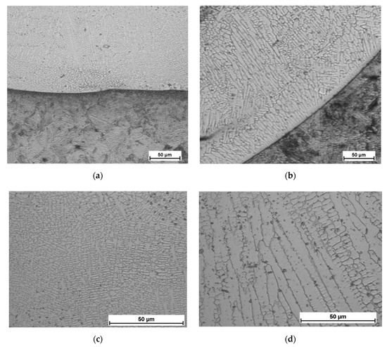 Microstructure of the comparative stringer beads LC4 and HC4 produced at the same process parameters (scanning speed 250 mm/min, laser output power 1000 W, energy input 240 J/mm) but different cooling conditions (Table 3 and Table 5): (a,c) forced cooling under cryogenic conditions in a liquid nitrogen bath—interface region and middle region of the clad, respectively; and (b,d) free cooling in ambient air—interface region and middle region of the clad, respectively.