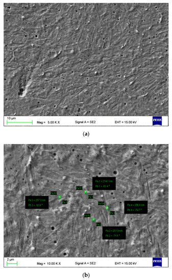 SEM micrograph in the middle region of the clad of stringer bead HC4 produced by the laser deposition of Fe-based powder (scanning speed 250 mm/min, laser output power 1000 W, energy input 240 J/mm) at forced cooling under cryogenic conditions in a liquid nitrogen bath (Table 3, Figure 12 and Figure 16): (a) an overview of the microstructure within the dendritic regions (typical martensitic morphology); and (b) a close view of precipitations in interdendritic regions with measuring the dimensions (201.9–356.8 nm).