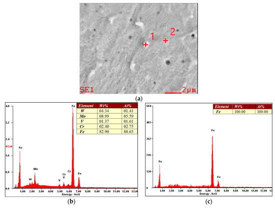 To more accurately determine the microstructure, SEM micrographs at high magnification were analyzed. The following is an example of the microstructure for the clad layer HC4 produced under cryogenic conditions. As can be seen in Figure 15, the typical very fine martensitic microstructure with clear retained austenite was disclosed within the dendritic areas, while highly dispersed nanometric-sized (200–360 nm) precipitations can be found in the interdendritic regions. Further EDS analysis indicated that the nanometric-sized precipitations are composed of tungsten, molybdenum vanadium, chromium, and iron, as shown in Figure 16. These results of SEM and EDS analysis clearly indicate that the dendritic grains are composed of solid solution based on Fe (Figure 16a,c), while the interdendritic regions are most likely composed of eutectic and precipitations of fine complex carbides (Figure 16a,b), which were identified by XRD analysis as M23C6 and M7C3, as shown in Figure 12.