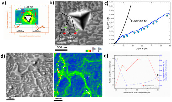 (a) Indent strain profile and (b) corresponding microstructure showing the dislocation motion across an A2/B2 interface. Dislocations experience strengthening when moving from the A2 to the ordered B2 phase, owing to spinodal and order hardening effects. The corresponding jerky dislocation motion is highlighted in nano-indentation load-displacement curves in (c). (d) shows the strain distribution with bright A2 phases being more plastic than the elastically stiffer dark B2 phase. (e) Corresponding misorientation profile and kernel average misorientation gradient on moving away from the interphase into the B2 phase. Figure 1d,e was adapted from [16] with permission from Elsevier, 2018.