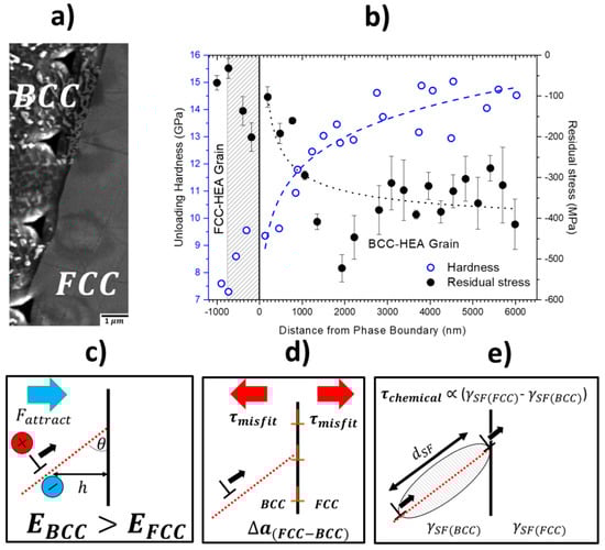 (a) BCC–FCC interface in an AlxCoCrFeNi high entropy alloy, with indent profile. (b) Variation of hardness and residual stress as a function of distance from phase boundary. The role of image forces is highlighted by local maximum in stress values on the BCC side (attractive image forces) and a local minimum on the FCC side (repulsive image forces). (c–e) illustrate different interfacial-dependent strengthening mechanisms. Figure 2b was adapted from [2] with permission from Elsevier, 2018.