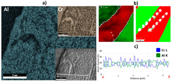 (a) EDS maps showing selective partitioning of Al and Cr into B2 and A2 phases, respectively. (b) Nano-indentation-induced phase transformation of A2 BCC phase (shown in red) to FCC phase (shown in green). Grain boundaries shown in white in the left image, and the non-indexed areas that are shown in white in the right image correspond to the experimentally made indents; local compositional fluctuations of Al and Cr indicated in (c), highlighting the instability of A2 BCC phases in regions of depleted Al, whereby such dynamic phase transformation to FCC at room temperature deformation is facilitated. Experimental data for the figures were derived from [16]. Figure 3b was adapted from [16] with permission from Elsevier, 2018.