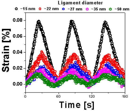 Nonetheless, electrochemical processes may lead to severe coarsening (undesired growth) of the ligaments [66,67,68], which is a major concern because actuation is hampered or completely lost, as is shown in Figure 4, where strain amplitudes are plotted as a function of the average ligament size. As expected, there has been a strong size effect and the strain amplitude recorded on nanoporous systems with different ligament sizes, and these may decrease upon increasing the ligament size (Figure 4). Even as a sensor (i.e., without external applied electric fields), the response is not stable due to coarsening effects (Figure 5), and, at higher temperatures, these effects are amplified tremendously.