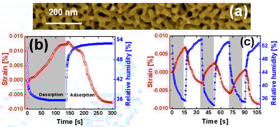 (a) Typical scanning electron micrograph of a nanoporous material (Au) that was synthesized by the dealloying process. The diameter of the ligaments was about 20 nm. (b) Display of the changes in relative humidity versus time for alternations of humid and dry air (blue curve refers to right ordinate) and corresponding strain versus time (red curve refers to left ordinate). (c) Responses of relative humidity versus time for long alternations of dry and humid air (blue curve refers to right ordinate) and corresponding strain versus time (red curve refers to left ordinate [67]).