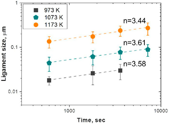 The solution to these instabilities is basically to reduce surface diffusion, and, for that reason, HEAs may offer a suitable solution. Recently, Soo-Hyun Joo and collaborators found an exceptional stability against coarsening of an MoNbTaTiV nanoporous HEA at elevated temperatures [55]. The ligament size and distribution of the HEA versus dealloying time at various temperatures are displayed in Figure 6.