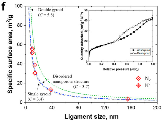 To make the coarsening behavior a bit more quantitative: Dealloying time, t, and ligament size, d, are written as a power function: 𝑑𝑛 = 𝑘𝑡𝐷, where n is the coarsening component, k is a constant, and D is the surface diffusivity. By plotting the ln[d(t)] vs. ln t curve, the coarsening exponent, n, can be measured. Figure 6 displays the measured specific surface areas of 55.7 (<10 nm), 38.8 (14 nm), and 3.6 (155 nm) m2/g, depending on the ligament size as obtained in [55] based on an analytical model we designed in the past [68]. The adsorption/desorption isotherm curve (inset in Figure 7) corresponds to a ligament size of about 10 nm. The hysteresis loop in the isotherm is associated with capillary condensation in nanopores (<50 nm).
