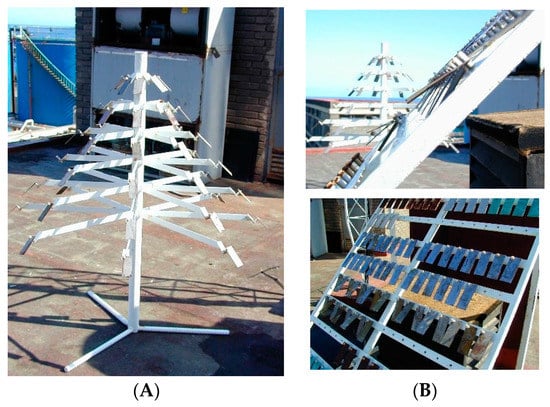 The test site consisted of two metallic frames on which the metal samples were attached using a nylon screw to avoid the formation of galvanic couples. For the orientation analysis, a tree-shaped metallic frame was built as shown in Figure 1A. The probes were located with an exposure angle of 45° and with eight different orientation angles (N, NE, E, SE, S, SW, W and NW). The distribution of the test panels in the different levels of this metallic frame prevented the downwards drainage of liquid or solid materials on the exposed panels. In a second metallic frame, carbon steel probes were placed with different exposure angles with respect to the horizontal (namely, 30°, 45° and 60°; see Figure 1B). The sensors for pollutants were located at the rear side of this frame, and they were collected on a monthly basis. The determination of sulphur dioxide pollution was made by the candle lead dioxide method according to the ASTM D 2010-85 norm [30]. Chloride measurements were performed using the wet candle method following the specifications of ISO 9225:1992 (E) [31].