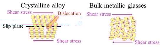 Bulk metallic glasses (BMGs), which are also called amorphous alloys, are another type of metallic materials with metastable glassy states. Most metals are crystalline, which have an atomic structure with a highly ordered arrangement. On the other hand, BMGs have a glass-like structure and a state of non-crystalline. BMGs are prepared by extremely rapid cooling and solidification of melting liquid alloys. The speed of cooling and solidification is high enough. Therefore, the nucleation of crystals can be suppressed without a long-range atomic order. Due to their amorphous atomic structures, BMGs show unique mechanical, physical, and chemical properties and are superior to conventional metallic alloys, i.e., crystalline alloys. On the other hand, the crystalline alloy has grain boundaries, dislocations, and segregations, which are disadvantageous. When the crystalline alloy is subjected to loading, it can easily fail because of its grain boundaries and dislocations. The crystalline alloy has slip planes. Shear stress can move the atomic structure alongside the slip plane and lead to plastic deformation. The plastic deformation can also be enhanced by the dislocations.