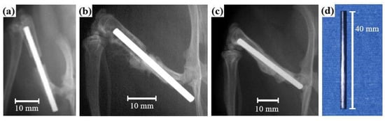 - Imai, K.; Hiromoto, S. In vivo evaluation of Zr-based bulk metallic glass alloy intramedullary nails in rat femora. J. Mater. Sci. Mater. Med. 2014, 25, 759–768. [Google Scholar] [CrossRef] [PubMed]