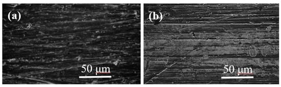 Scanning electron microscopy (SEM) images of Zr65Al7.5Ni10Cu17.5 BMGs rod (a) before and (b) after 12 weeks of implantation. Polishing scars were observed in both images. No reactions nor changes were observed after the in vivo experiment.