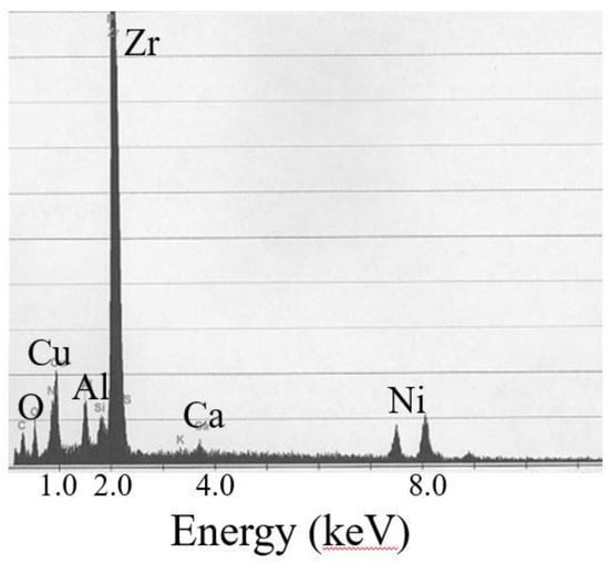Energy dispersion X-ray spectroscopy (EDS) image of Zr65Al7.5Ni10Cu17.5 BMGs rod after 12 weeks of implantation. Oxygen (O) and calcium (Ca) were noted with the exception of Zr, Al, Ni, Cu. No element of corrosion was noted, which showed anti-corrosion behaviour.