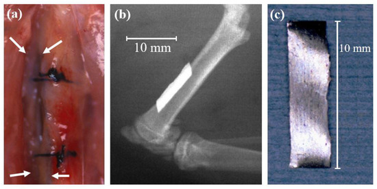The third type is the sub-periosteal implanted on the bone surface of rat femora [,]. Zr65Al7.5Ni10Cu17.5 BMGs ribbons 10 mm in length, 2 mm in width, and 0.5 mm in thickness were implanted on the bone surface for six weeks (Figure 5). After the implantation, systemic effects were investigated using a blood test. Femur and soft tissues around the implant were investigated through a histological examination. Removed implants were investigated using SEM equipped with EDS. The results show that blood levels of Cu and Ni did not increase, and no findings of the biological effects were recognized including cell necrosis or dysplasia, infiltration of inflammatory cells, bone resorption, and wear debris of the alloy. Regarding removed implants, there were no findings of breakage nor pitting corrosion.