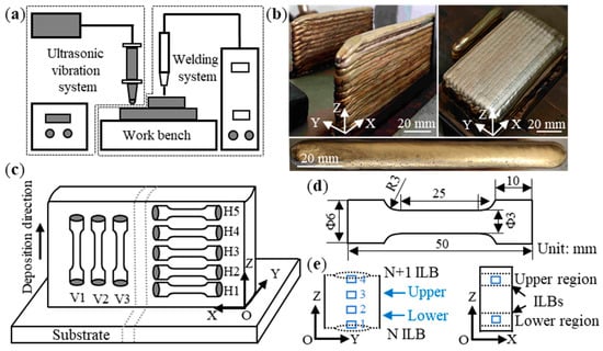 (a) Schematic diagram of the experimental apparatus of ultrasonic vibration during WAAM, (b) typical WAAM fabricated samples, (c) schematic configuration of the sample preparation, (d) dimensions of tensile specimens in mm, (e) schematic diagram of microstructure observation position.