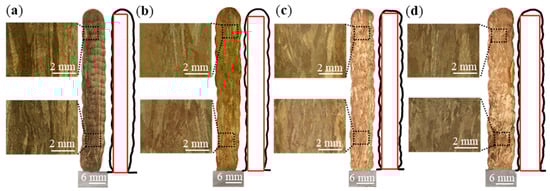 The effect of ultrasonic vibration and interpass temperature on macrostructure is shown in Figure 2. The NAB components fabricated using the WAAM process with or without UVA treatment reached full density and no porosity defect was found in the cross-sections (C1 and U1 samples are continuous deposition with higher interpass temperature and poor forming, which are not compared in this paper). It can be found that columnar grains grow epitaxially along the deposition direction, and the interlayer bands (ILB) are clearly visible in the interpass temperature 400 °C sample (Figure 2a). The similar results are shown in the interpass temperature 100 °C samples, as the size of the columnar grains decreased, resulting in the reduction of the contrast, which made it difficult to characterize the ILB (Figure 2b). In the UVA treatment of WAAM specimens, the grain size is further refined and the deposited layer becomes wider (Figure 2c,d). The width of the thin walls increased from 7.5–8.0 mm to 8.5–9.0 mm after treatment UVA. The size of the WAAM component is decided by the shape of the molten pool [12]. The ultrasonic vibration is able to accelerate the relative movement between the solid phase and surrounding liquid phase in the molten pool, leading to a better spreading of the molten pool on the previously deposited layers. This is beneficial for increasing the effective area of deposition. A schematic diagram of the effective area of deposition is shown on the right side of the macrostructure in Figure 2, and the results are listed in Table 1. The experimental results show that the U3 sample enables the maximum deposited efficiency, reaching 84.8%.