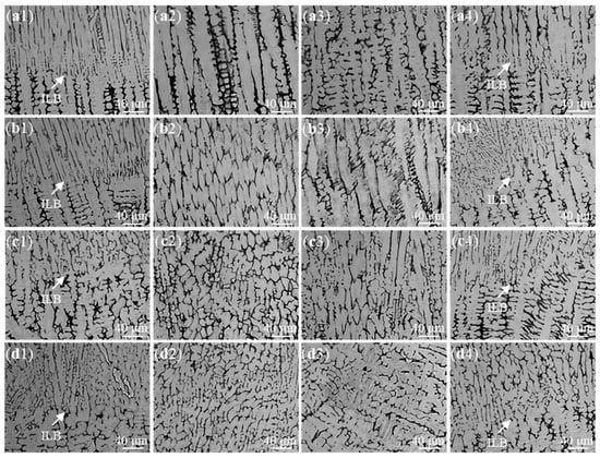 When the UVA treatment WAAM is under the interpass temperature of 400 °C, part of the columnar dendrites structure is fractured and the grain size is further decreased (as shown in Figure 3c1–c3). At the top of the molten pool that is near the ILB, abundant columnar dendrites with SDAs are also found (Figure 3c4). Hence, a mixed microstructure contains the coarse cellular dendrites, cellular grains and columnar dendrites, which are formed in UVA treatment WAAM samples with a higher interpass temperature. With further decrease of interpass temperature at 100 °C, the microstructure is refined to form a cellular structure and the grain boundaries are shortened (Figure 3d1–d4). Similar microstructure evolution has been reported for fabrication using laser additive manufacturing [23,25] and welding process [21,31]. Ultrasonic vibration induces acoustic streaming and cavitation caused the stirring and mixing of liquid materials in the molten pool [18,32,33]. Meanwhile, the effect of heating accumulation can be eliminated by controlling the interpass temperature. The actions of stirring and mixing lead to a homogenizing density and heat in the molten pool, which contribute to the uniform distribution of grains and the formation of a cellular structure with uniform grain boundaries.