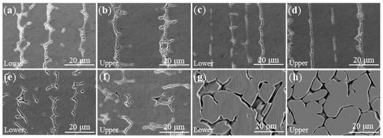 As we know, the microstructure is very sensitive to temperature, while the different locations of the deposited wall during the WAAM process undergo rapid melting and solidification with a complex thermal history, so it is necessary to observe the microstructure in different deposited heights. Figure 5 shows the microstructure in the X-Z plane of each component is described in lower and upper regions (the location is shown in Figure 1e). All of the samples without UVA treatment have coarse columnar dendrites grown epitaxially along the deposition direction, as shown in Figure 5a–d, which accord with the observation in the Y-Z plane. Continuous columnar dendrites are blocked by UVA treatment in the U2 sample and the broken character can be seen more clearly in the high magnification SEM image (Figure 5e,f). A similar cellular structure is found in the UVA treatment at an interpass temperature of 100 °C sample (Figure 5g,h). It is important to point out that different vertical locations strongly effect PDA spacing. In the C2, C3, and U2 samples, the PDA spacing is coarsened with increasing deposition height. After analysis by the quantitative metallography method, the average PDA space of the C2, C3, U2, and U3 samples is around 28.5 ± 4.2 μm, 21.6 ± 3.6 μm, 26.8 ± 3.1 μm, and 18.6 ± 2.6 μm, respectively.