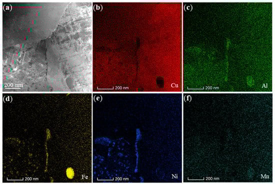In order to reveal the various intermetallic phases in the interdendritic regions and α-Cu matrix, detailed TEM observations of the U3 sample were studied. Figure 8 and Figure 9 show the distribution features of elements at the interdendritic regions and α-Cu matrix. The interdendiritic regions display two types of intermetallic phases, κII phase in the different globular sizes (Range from some nanometers to tens nanometers) and κIII phase in the lamellar morphology, and EDS elemental mapping distinctly reveals the morphology (Figure 8). The κII and κIII phase are found to be Fe3Al and NiAl, respectively, based on the selected area diffraction pattern analysis, as shown in Figure 10a,b,d,e. Some amounts are very fine to the sizes of κIV phase (Fe-rich, 5 to 10 nm in size) precipitate is observed in the α-Cu matrix (Figure 9). The observation of fine Fe-rich precipitation and precipitation-free areas is distributing non-uniformly in the α-Cu matrix, which may be resulted by the different effects of thermal cycling of the WAAM on different locations. Selected area diffraction pattern analysis reveals the κIV precipitates have a composition and crystal structure is similar to that of κII based on Fe3Al (Figure 10c,f). It is possible that the κII and κIV are being precipitated at the same temperature from the same phase [5]. The small and disperse κIV phases may inhibit grain boundary mobility, which beneficial for improving strength [38], and also preventing grain growth [4].