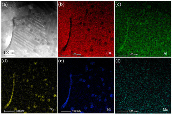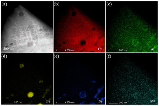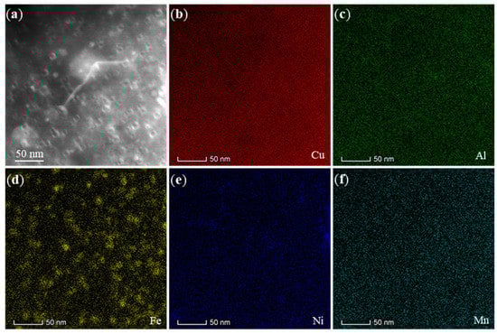 (a) HAADF image of the UVA treatment WAAM in the α-Cu matrix region, (b–f) corresponding EDS elemental maps for Cu, Al, Fe, Ni, and Mn, respectively. The precipitates are Fe-rich (κIV) in the α-Cu matrix.