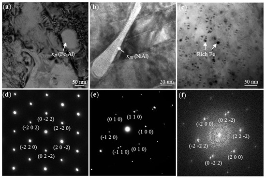 TEM-bright field micrographs images and selected area diffraction pattern: (a) κII precipitates (Fe3Al) in the interdendritic, (b) κIII precipitates (NiAl) in the interdendritic, (c) κIV precipitates (Fe-rich) in α-Cu matrix, (d–f) corresponding selected area diffraction pattern Fe3Al, NiAl and Fe-rich, respectively.