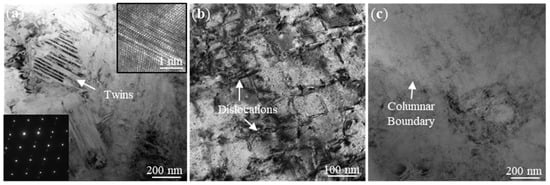 The results of TEM observation shows that the twins and dislocations can be found near the interdendritic region of the sample with UVA treatment. In the specimen process with UVA treatment at interpass temperature of 100 °C, the coexistence of twins and interdendritic is shown in Figure 11a. The high-resolution HRTEM micrograph and corresponding selected area electron diffraction are inserted in Figure 11a, which further verifies the structure of twins. The areas between the twin bands, which are tens of nanometers in thickness, seem to be parallel to each other, and EDS elemental mapping indicates that this parallel twinning may rely on κIII precipitates (NiAl) in the interdendritic region (Figure 12). Figure 11b presents a density of dislocations in the U3 sample. The dislocations form rectangular blocks of 50–120 nm in size. EDS elemental mapping reveals that there is no obvious precipitated phase in the dislocations (Figure 13). Meanwhile, the microstructure, that is without UVA treatment, specimens is simpler, as no obvious twins and dislocations occurs in the C3 specimen, as shown in Figure 11c. Hence, combining previous studies [39,40] and the results obtained in this study, it can be concluded that the action of UVA treatment WAAM solidification process can help to create twins and dislocations. The twins and dislocations may contribute to strengthening of the WAAM NAB alloy by acting as a grain boundary and blocking the lattice dislocation motion [41,42].