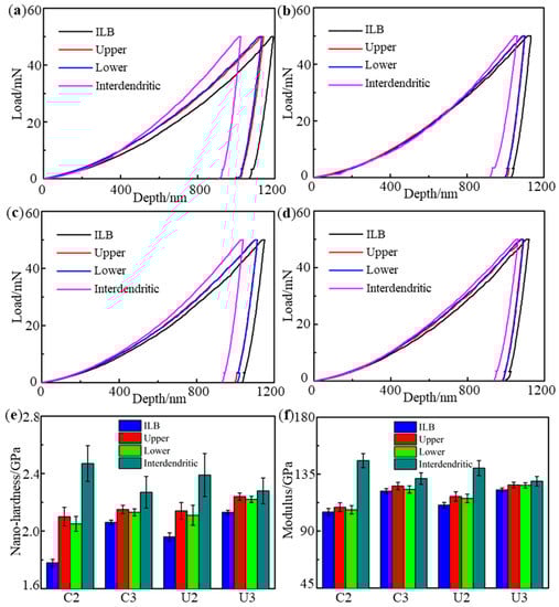 To acknowledge the variation of nano-hardness and modulus by the ultrasonic vibration and interpass temperature, the nano-indentation tests are conducted on the interdendritic region, ILB, α-Cu matrix lower and upper the ILB, respectively. Typical load-depth cures for four regions in C2, C3, U2 and U3 samples are plotted in Figure 14a–d. It can be seen that the contract depth, maximum depth and final depth in the interdendritic region are shallower than those in the α-Cu matrix and ILB, which could partly reflect a greater nano-hardness of the interdendritic region. Besides, the ILB exhibits the maximum depth, which means that the nano-hardness value of the area is the minimum. In addition, the indentation test curves indicate a good repeatability with UVA treatment under interpass temperature of 100 °C samples (Figure 14d).