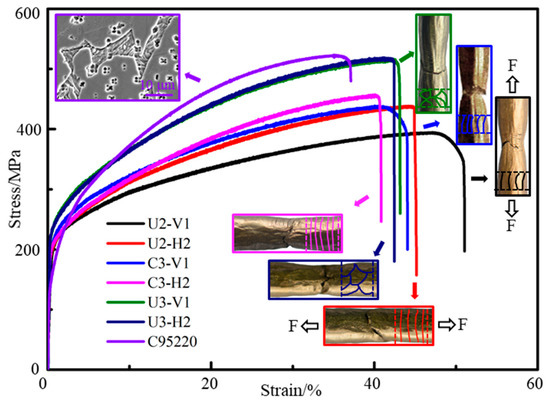 Tensile properties of specimen U2, C3 and U3 are tested according to the effective area of deposition (Table 1) and the finer grain size (Figure 3). The typical stress-strain curves for the three conditions of the WAAM samples and cast C95220 alloys, as well as the tensile properties determine from these curves, are compared in Figure 15. It can be seen that all of the WAAM samples are found to exhibit considerably higher yield strength (YS) and elongation (EL) as compared to the cast samples. The cast C95220 alloys has higher ultimate tensile strength (UTS) than that of WAAM samples due to more contents of Al, Ni and Fe elements (the microstructure of C95220 alloys is shown in the inserted picture at the top left). The figures demonstrate that though the nature of the flow curves of the U2, C3 and U3 samples are similar, there is a marked difference in their properties. The yield strength of the U3 samples (224–227 MPa) are higher than that of the C3 (200–204 MPa) and U2 samples (189–193 MPa). In the perspective of NAB component engineering design, yield strength is more relevant than ultimate tensile strength. On the other hand, the ultimate tensile strength of U3 (515–518 MPa) samples are also higher than C3 (434–458 MPa) and U2 samples (387–438 MPa). The anisotropy of UTS exists in C3 and U2 samples. Regarding ductility, the elongation of U3 samples (40.56–41.42%) are comparable to that of the C3 samples (39.95–42.8%), while specimens prepared from U2 samples exhibit higher ductility (42.2–50.87%). The detailed results of the average tensile properties in the vertical direction (V) and horizontal direction (H) within the UTS, YS and EL are listed in Table 2.