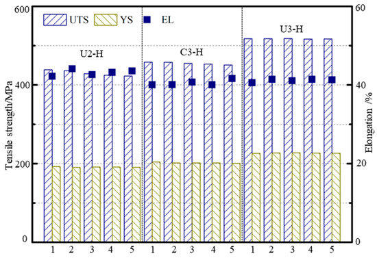 In order to study the interpass temperature and UVA treatment effects on different locations along the deposition direction on the tensile properties of the fabricated wall, the tensile properties at different heights along the deposition direction are tested. Experimental results are shown in Figure 16. In the U2 and C3 samples, the UTS is more sensitive to the locations within the build and decreasing along the build height. The near to substrate sample shows the highest UTS, which is caused by the finer microstructure in the bottom region. In addition, although the UTS of the samples at different heights differ, no clear trend can be identified in YS and ductility in the U2 and C3 samples. In addition, when a low interpass temperature of 100 °C is used, less decrease of UTS is generated along the deposited direction in C3 samples. After UVA treatment under an interpass temperature of 100 °C, the tensile properties of the samples at different heights tend to be stable. Hence, from both horizontal and vertical tensile properties consequences, it is considered that the tensile properties are symmetrical within the U3 samples. The UTS, YS, and EL of the U3 samples are 517.0 ± 0.89 MPa, 226.2 ± 0.95 MPa, and 41.01 ± 0.29%, respectively. Among all the test samples, anisotropy is well controlled in the samples with UVA treatment at an interpass temperature of 100 °C, and the increase of UTS and YS is not accompanied by any drop in the ductility.