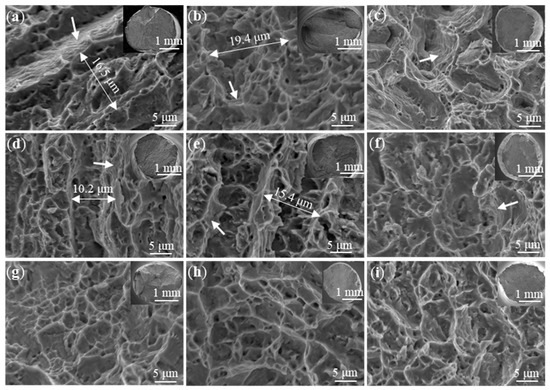 Fracture surfaces of tensile samples: (a) U2-H2, (b) U2-H4, (c) U2-V2, (d) C3-H2, (e) C3-H4, (f) C3-V2, (g) U3-H2, (h) U3-H4, (i) U3-V2. (The white arrow indicates the characteristics of slip separation).