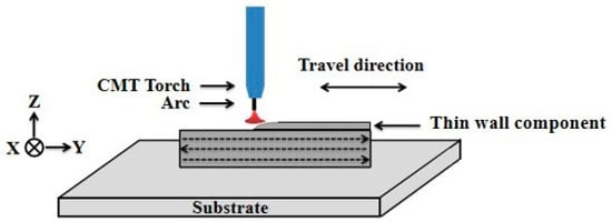 AM refers to a technology that usually joins materials together by layers, which has been developed rapidly due to its high material utilization and high geometric freedom [3]. Compared with conventional technologies, AM is good at manufacturing complex components, especially those that can be performance-customized within a certain time [4,5]. When considering AM technique used for metallic alloys, wire and arc additive manufacturing (WAAM) offers better competitive advantages over other techniques such as a higher deposition rate, lower cost, and high buy-to-fly ratio of components that can be realized within a shorter delivery time. Meanwhile, WAAM can also overcome many difficulties associated with manufacturing special alloys [6,7,8], such that it has increasingly shown the great potential in the manufacture of large metal parts by an arc-based process [9]. The typical WAAM can be divided into gas tungsten arc welding (GTAW), plasma arc welding (PAW), and gas metal arc welding (GMAW) as heat sources. As a modified GMAW process, cold metal transfer (CMT) has some advantages, such as low energy input, high deposition rate, no spattering, and extremely stable arc, therefore this AM technique has become a popular as well as widely used technique. The excellent characteristics of CMT make it to be an ideal process for fabricating a large-scale part, which can overcome common troubles encountered during conventional welding process [10,11]. In this study, it was adopted as the heat source during the deposition process.