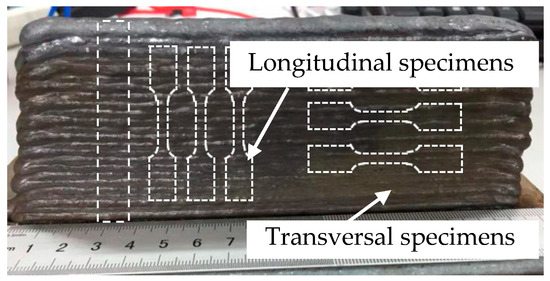 The results of transversal and longitudinal tensile tests are listed in Table 3. As summarized from the data, the transversal tensile property obtained is better than that of the longitudinally stretched, indicating an anisotropy behavior, which usually occurs in the process of WAAM [29].