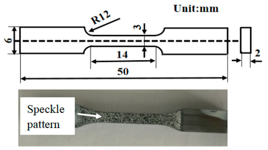 The deposited component was prepared for the analysis of the microstructure and mechanical properties. For consistency, all specimens were adopted from the homogeneous and stable parts of the component. The specimens, which were used to analyze the surface quality, microstructure evolution, and Vickers hardness (HV 0.2) of the top and the bottom, were drawn from the cross section of the component by a ZwickRoell Indentec (ZwickRoell, Ulm, Germany) testing machine. The tensile experiments were carried out using a Shimadzu AG-X plus (Shimadzu Scientific Instruments, Shanghai, China) as the tester with a displacement rate of 0.02 mm/s. All tests were performed at room temperature. The specific sampling location is shown in Figure 2. Both transversal and longitudinal tensions were performed to obtain the data of strain evolution during the testing to reveal the anisotropy behavior. Before the tests, specimens were sprayed with a randomized speckle pattern that consisted of black micron size speckles on a white background to achieve high contrast. The size and surface treatment condition of the specimen is shown in Figure 3.