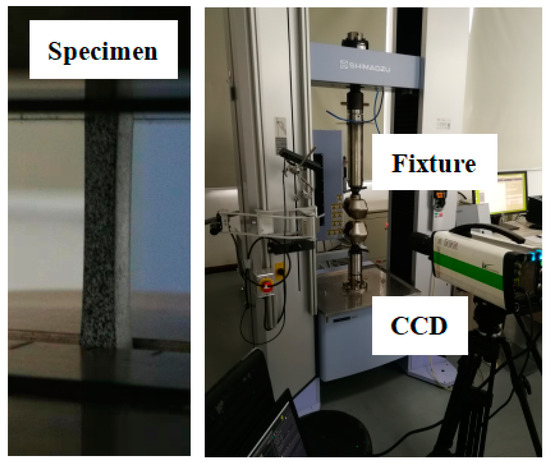 During the testing, the strain and surface displacements were calculated by tracking the speckle pattern on the specimen surface. Images were captured using an iX i-SPEED 7 CCD camera (iX Cameras, Shanghai, China) at the rate of 10 fps (frames per second), with a pixel array of 350 × 750 pixels. Then, the data were analyzed by DIC software to obtain the strain field distribution [19]. The experimental setup is shown in Figure 4.