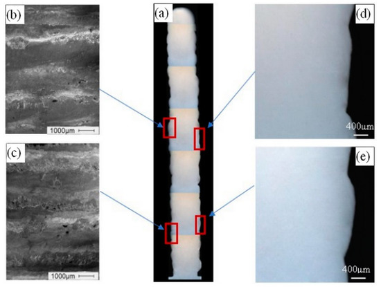 Figure 5. Assessment of the surface quality of the component: (a) Overall condition on cross section; (b,c) surface condition analyzed by SEM; (d,e) inter-layer adjacent region condition analyzed by OM.