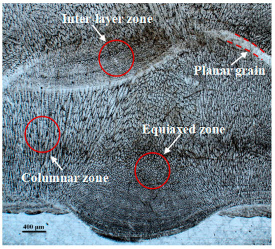 In the process of WAAM, the heat cycle repeats over and over again. Some typical phenomena are caused by complex thermal cycles such as rapid heating, fast solidification in the fusion zone, various temperature gradients, a large amount of heat accumulated, reheated, and then recooled. The non-equilibrium thermodynamics governs the physical characteristics of microstructure formation in the WAAM process. Thus, analyzing microstructural characteristics and evolution is helpful for describing the manufacturing process [21]. Based on the thermal history illustrated above, the microstructure can be divided into three main morphologies: (1) columnar, (2) mixture of columnar and equiaxed, and (3) equiaxed. In other words, during the WAAM process, the microstructure can be divided into three different regions: (1) columnar grain zone, (2) boundary zone, and (3) equiaxed grain zone, as shown in Figure 6. The evolution of the microstructure is influenced by two crucial control parameters including the temperature gradient (G) and solidification velocity (SV) [22]. Based on solidification theory, the ratio of the G to SV determines the forms of the microstructure. When the G/SV is extremely large, the solidification microstructure contains planar grains, as shown in Figure 6. In this condition, the melt metal acts upon the former solidified layer and solidifies rapidly, G tends to be infinite, and VS tends to be zero. When the G/SV is a relatively high value, the major solidification microstructure is columnar grain, as shown in Figure 6; at that moment, the heat dissipation that comes from the substrate results in a rapid cooling speed and high temperature gradient. The melt metal solidifies quickly and then the columnar grain is obtained. In a general way, the core of the molten pool is finally solidified. The temperature gradient and solidification velocity tend to be low, resulting in smaller G/SV values, giving rise to the equiaxed grains as shown in Figure 6. In a word, heat is mostly transmitted through the substrate or formerly deposited layers, and different regions of the molten pool appear to have various temperature gradients and solidification velocities, which eventually influences the evolution of the microstructure.