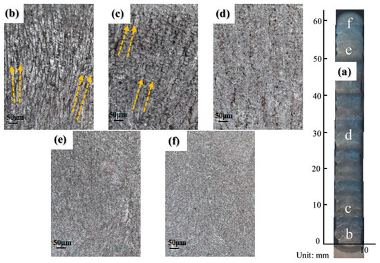 Figure 7. Microstructure evolution for different parts of the as-deposited component: (a) Macrostructure of the cross section; (b) Region b; (c) Region c; (d) Region d; (e) Region e; (f) Region f.