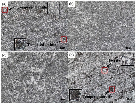 It is well know the phase transformation and microstructure development of the metal component fabricated by WAAM are completely different compared to that of conventional manufacturing. The WAAM fabricated components undergo a slower cooling rate and gradual/equilibrium thermodynamics processes, thereby obtaining more homogeneous properties. In this study, the phase transformation at different positions of (from bottom to top) the component is investigated and reported in Figure 8, in which Figure 8a shows the details of the typical phases of the bottom part. Here, the phase transformation analysis is based on phase morphology and the continuous cooling transformation diagram of a high strength steel with a similar chemical composition [24]. At the beginning of deposition, since the bottom layer is affected by the substrate and is then cooled rapidly, thus martensite transformation occures. It plays a tempering role under the influence of a long-term thermal cycle in the subsequent deposition layer, with the occurrence of tempered sorbite transformation. Along with the tempered sorbite transformation, the major phase transformation is bainite due to the intermediate cooling rate. Under the action of tempering, tempered bainite is achieved. Thus, the phase composition at the bottom is tempered bainite and tempered sorbite. As deposition continues, the part close to the bottom moves away from the substrate gradually, lowering the cooling rate and heat dissipation, thereby reducing the content of tempered sorbite. At this time, the phase composition at the bottom is tempered bainite and less tempered sorbite, as shown in Figure 8b. As deposition height increases heat accumulation approaches saturation state, while the heat input and output are in balance, which presents a lower temperature gradient and cooling rate, resulting in the fact that it could not achieve the transformation requirement of tempered sorbite. As a consequence, the phase composition at the middle is almost made up of tempered bainite, as shown in Figure 8c. When deposition arrives at the end, the melt pool emerges at a rapid cooling rate due to mass heat dissipation with the environment, which allows the tempered sorbite transformation to occur again [25]. At the same time, some ferrite transformation takes place due to the lack of subsequent heating. Under this circumstance, the phases on the top are composed of tempered bainite, tempered sorbite, and ferrite, as reported in Figure 8d. In general, the complex phase transformation is caused by distinct thermal cycles and various cooling rates. This phenomenon eventually results in different phase transformation in diverse regions.